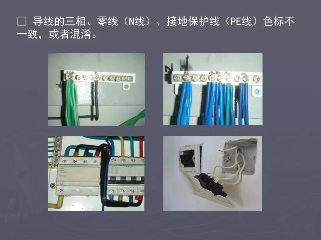(4)导线的三相、零线(N线)、接地保护线(PE线)色标不一致,或者混淆。