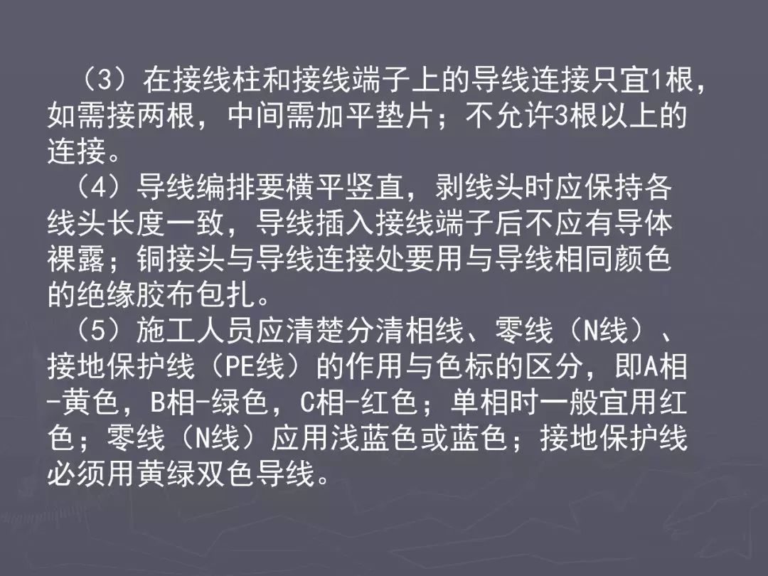 (6)施工人员应清楚分清相线、零线(N线)、接地保护线(PE线)的作用与色标的区分,即PA相-黄色,B相-绿色,C相-红色;单相时一般宜用红色;零线(N线)应用浅蓝色或蓝色;接地保护线(PC级)必须用黄绿双色导线。