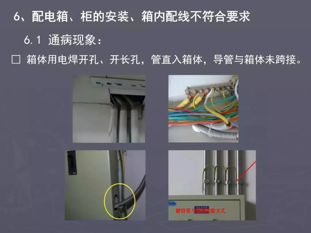 (4)电线管进入配电箱,管口在箱内不顺填,露出太长;管口不平整、长短不一;管口不用保护圈;未紧锁固定。