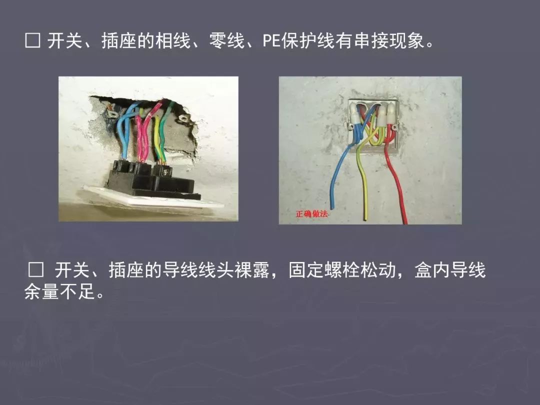 (3)开关、插座的相线、零线、PE保护线有串接现象。