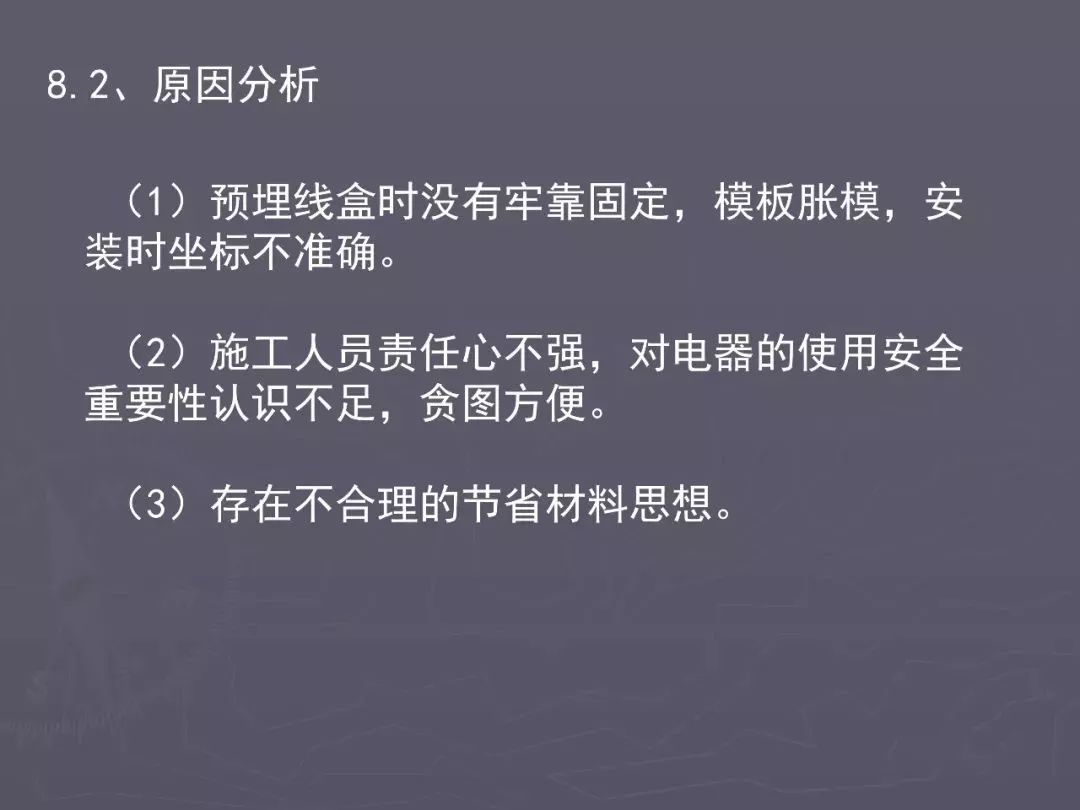 (1)预埋线盒时没有牢靠固定,模板胀模,安装时坐标不准确。