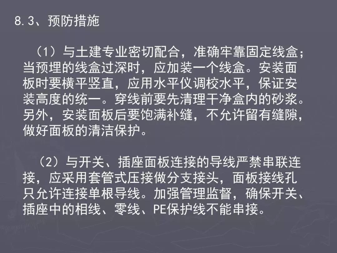 (2)加强管理监督,确保开关、插座中的相线、零线、PE保护线不能串接,先清理干净盒内的砂浆。