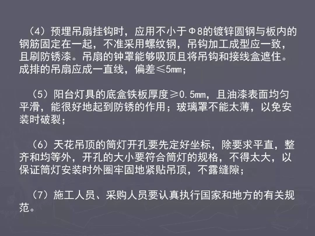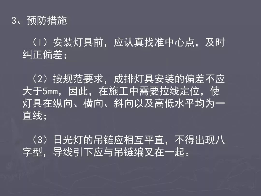 (2)按规范要法语,成排灯具安装的偏差不应大于5mm,因此,在施工中需要拉线定位,使灯具在纵向、横向、斜向以及主同低水平均为一直线。