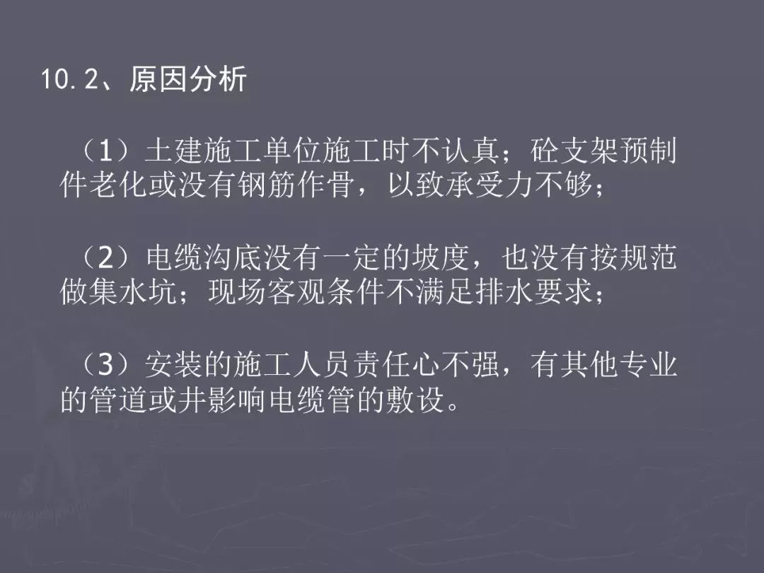 (2)电缆沟底没有一定的坡度,也没有按规范做集水坑;现场客观条件不满足排水要求。