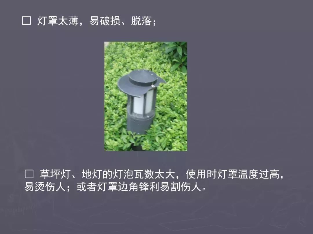 (4)草坪灯、地灯的灯泡瓦数太大,使用时灯罩温度过高,易烫伤人;或者灯罩边角锋利易割伤人。