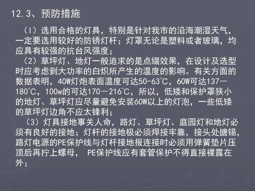 (l)选用合格的灯具,特别是针对我市的沿海潮湿天气,一定要选用较好的防锈灯杆;灯罩无论是塑料或者玻璃,均应具有较强的抗台风强度。