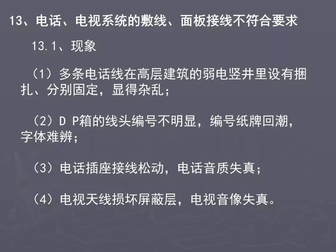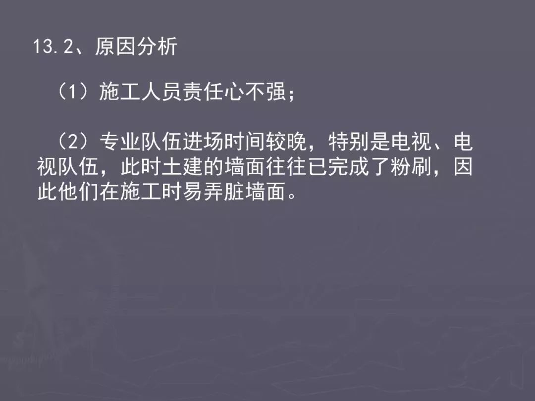 进场时间较晚,作为专业队伍,从现场条件的具备到为了防止布线被偷,电视、电视队伍一般进场较晚,此时土建的墙面往往已完成粉刷工序,因此他们在施工时易弄脏墙面。