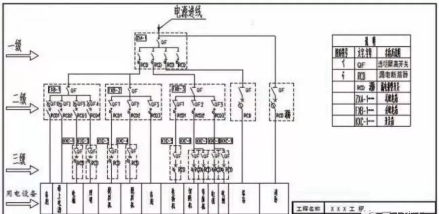 三级配电主要指:现场总配电箱、分配电箱、开关箱,其中分配电箱可以多层次,当工程规模较大时,也可以实行多级(三级以上)配电;逐级漏电保护主要指:现场总配电箱、分配电箱、开关箱每级箱内均设漏电保护器。施工现场必须实行TN-S系统,严禁使用可调式漏电开关。