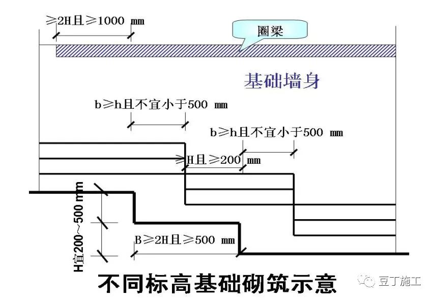1、基底标高不同时,基底应按1:2的台阶逐步放坡,基础砌体应从低处砌起,并应由高处向低处搭砌。当设计无要求时,搭接长度不应小于基础扩大部分的高度且不宜少于500mm。