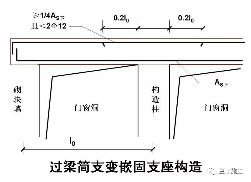 10、当梁端实际受到部分约束但按简支计算时,应在支座区上部设置纵向构造钢筋,其截面面积不应小于梁跨中下部纵向受力钢筋计算所需截面面积的1/4,且不宜少于2Ф12的钢筋,该纵向钢筋构造自支座边缘向跨内伸出的长度不应小于0.2l0。