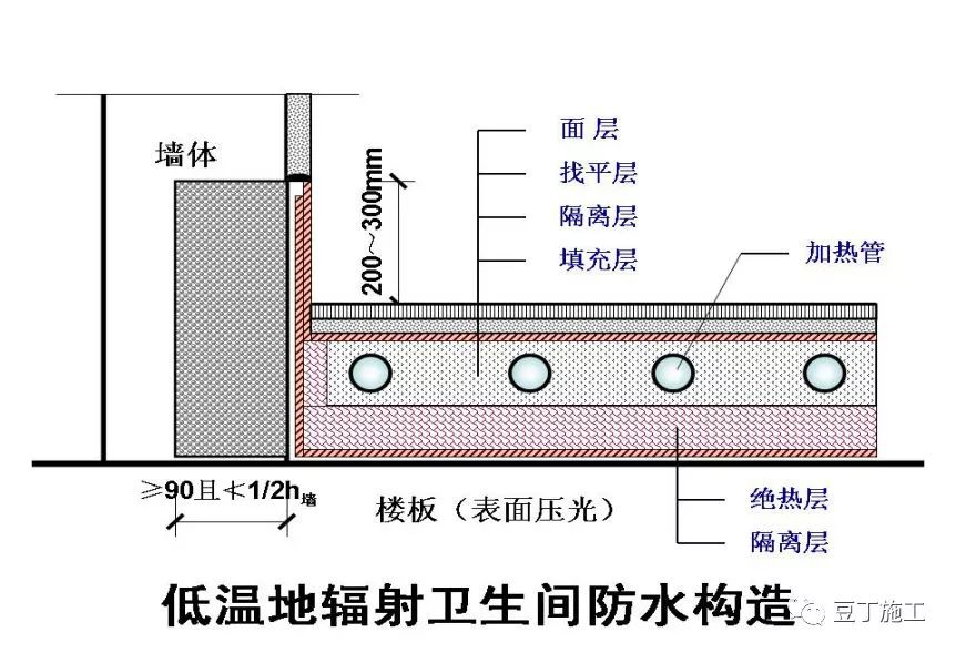 17、设置地面辐射供暖系统的卫生间地面必须在绝热层下和填充层上各做一层柔性防水层并应在卫生间过门处设置不少于150mm厚且不小于S6的抗渗混凝土止水墙。