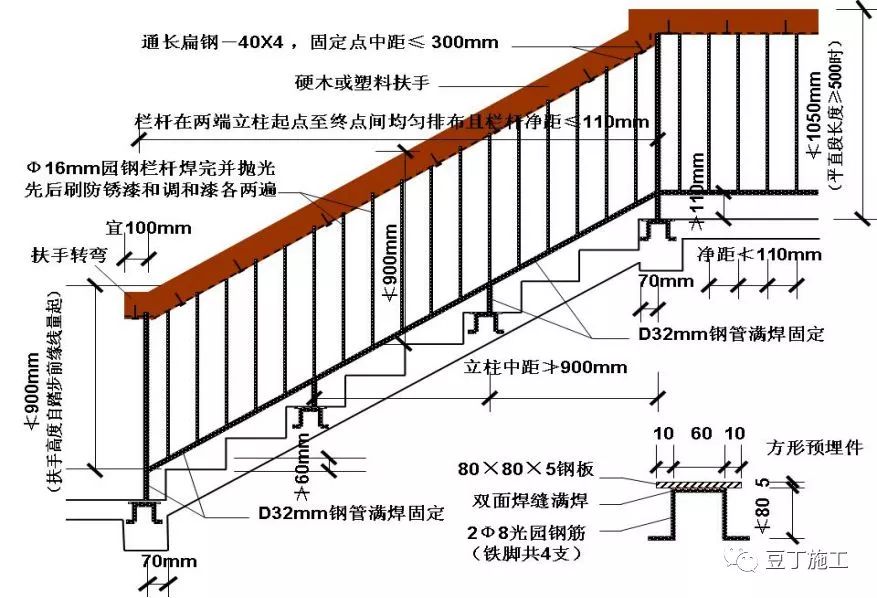 18、室内楼梯扶手高度自踏步前缘线量起不应小于0.90m。靠楼梯井一侧水平扶手长度超过0.50m时,其高度不应小于1.05m。而住宅、托儿所、幼儿园、中小学、少年儿童专用活动场所以及文化娱乐建筑、商业服务建筑、体育建筑、园林景观建筑等允许少年儿童进入活动的场所栏杆必须采取防止少年儿童攀登的构造,当采用垂直杆件做栏杆时,其杆件净距不应大于0.11m。