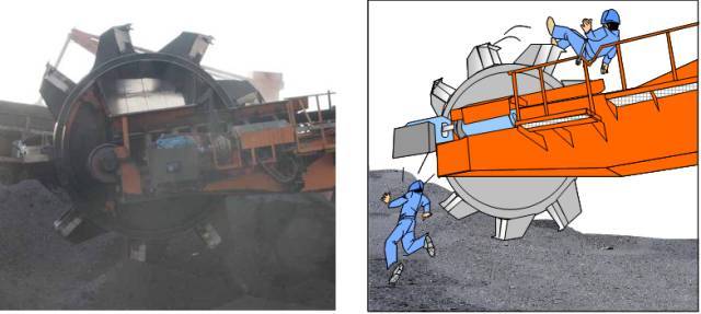 司机突然想起斗轮机需连续试运,没有到就地检查斗轮机是否具备启动条件,只是在司机室瞭望,便启动斗轮机。导致一名人员被旋转的斗轮带起甩到倒流板的篦子上死亡,另一名人员从斗轮上跳下来,捡了一条命。