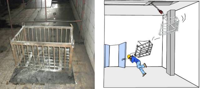 某年8月7日,某厂进行煤仓封堵工作,需将地面物料用吊篮运至30米高的煤仓处。在吊运过程中,吊篮碰到墙壁发生旋转倾斜,钢丝绳脱钩,吊篮跌落,将一名地面工作人员严重砸伤。