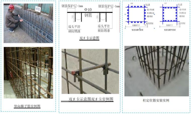 4、柱定位箍设置在楼面标高以上500mm处,定位卡钢筋中心间距为钢筋直径加3mm。