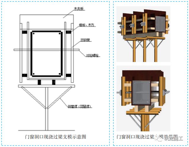洞口模板根据图纸尺寸加工成定型模板,模板阴阳角处均用角钢与木模板固定,内部采用双排双向、菱形支撑,洞口模板下部设置排气孔,侧面加贴海绵条防止漏浆,浇筑混凝土时从洞口两侧同时浇筑,避免模板偏位。
