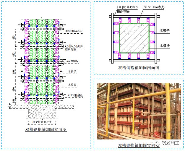 1、单槽钢抱箍加固适用于截面尺寸<1200mm 框架柱,具有足够的刚度及稳定性,能可靠地承受浇筑混凝土的重量、侧压力以及施工荷载;