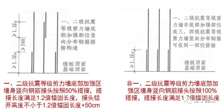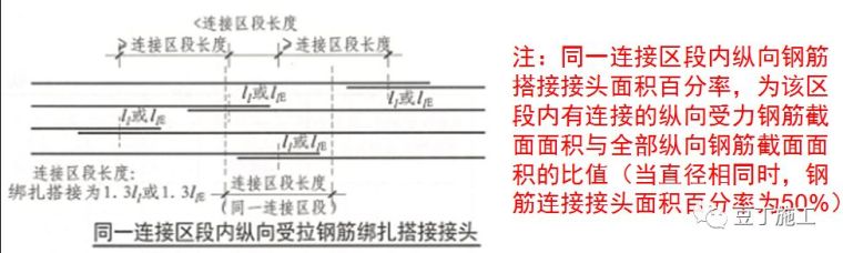 3、纵向钢筋搭接接头按照100%搭接接头时,接头位置在满足规范要求的同时确保在同一平面高低;按照50%搭接接头时,接头位置在满足规范要求的同时确保在高低两个平面高低。