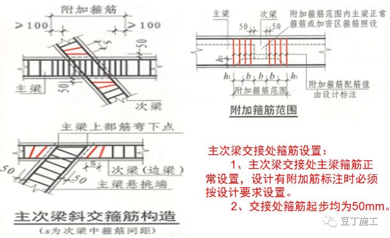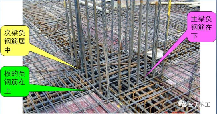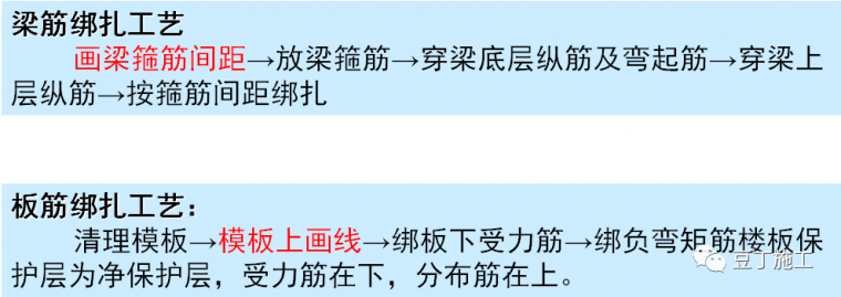 1、梁板钢筋上层弯钩朝下,下层弯钩朝上,相同箍筋接头交错布置在两根纵向架立筋上。纵向受力筋为多层时,层间垫钢筋头,保证其间距。