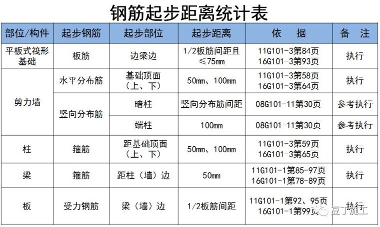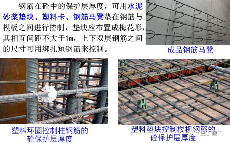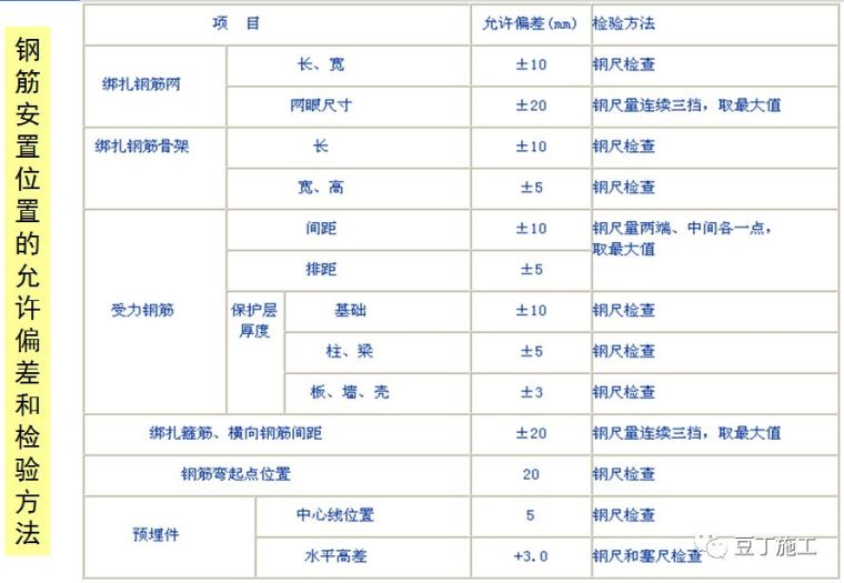 2、梁纵向受力筋:上筋净距30mm或1.1d(d为最大钢筋直径),下筋净距 2.5mm或d;下部纵向钢筋配置两层的,钢筋水平方向中距比下面两层中距增大一倍。3、梁的下部钢筋不在跨中1/3范围搭接或连接,上部钢筋不在支座1/3范围搭接或连接。4、梁高度过高,无法架空绑扎的,必须确保绑扎成型质量;先绑梁,后封侧模。5、板中钢筋从距墙或梁边5cm开始配置;6、板的下部钢筋不在跨中1/3范围搭接或连接,上部钢筋不在支座1/3范围搭接或连接;