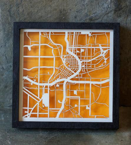 这一张是在亚光钢板上用的激光切割,彩色线线勾边。
