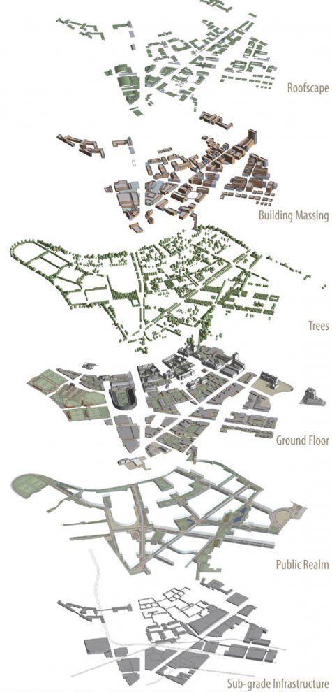 当然理想情况下还是分层表现的好。为每一种元素单独设一层,场地的现状和城市布局的逻辑性看起来会更加的直观: