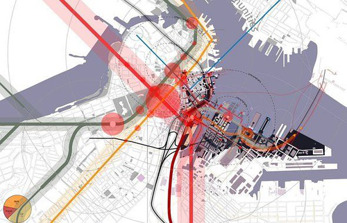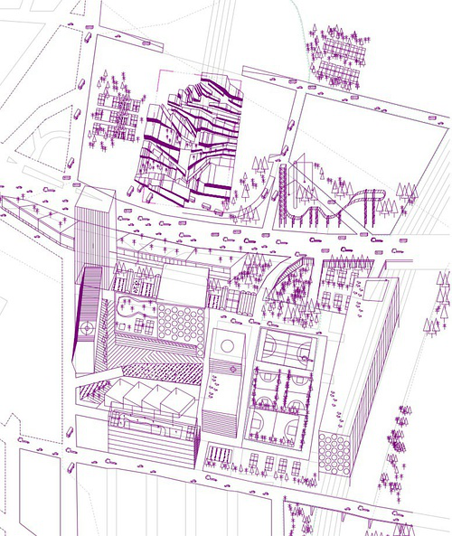 场地周围建筑的功能通常也会对方案和概念产生很大的影响。如果作品中对公共空间的质量进行了探讨,那么场地周遭的建筑功能就是必不可少的一个参考因素,一定要表现出来。通常都是采用颜色区分的方式来进行表达: