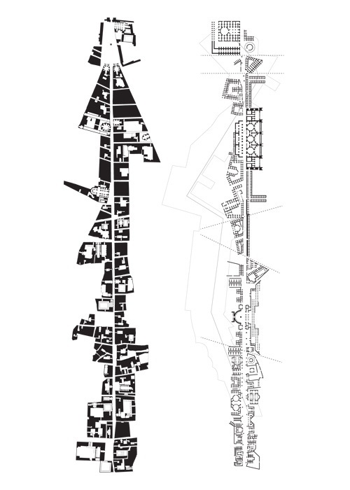 有事光标注建筑物的体块、位置并不够,必要的情况下还要绘出这些公共空间的平面。之前发过的Nolli Map是这种画法中的经典,但画整个城市范围的公共空间平面实在不现实,下图的方法更合适: