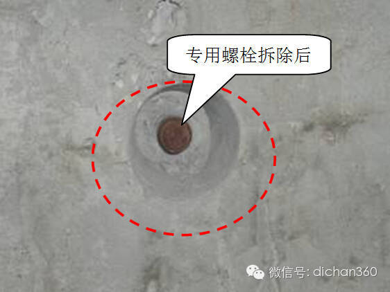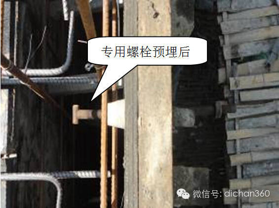 3、任何情况下顶模不少于3套、墙模不少于2套。剪力墙不得少于五道拉杆(按2.85米的标准层高计算),外墙或楼梯间内层间砼接茬部位易出现错台、漏浆问题,要求在下层砼浇筑前在梁或墙内统一预埋专用螺栓(如下图),同时将该部位的外侧模板下返100-150mm,配合海绵条的使用,保证该部位模板加固紧固严密,杜绝漏浆、错台现象发生。