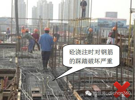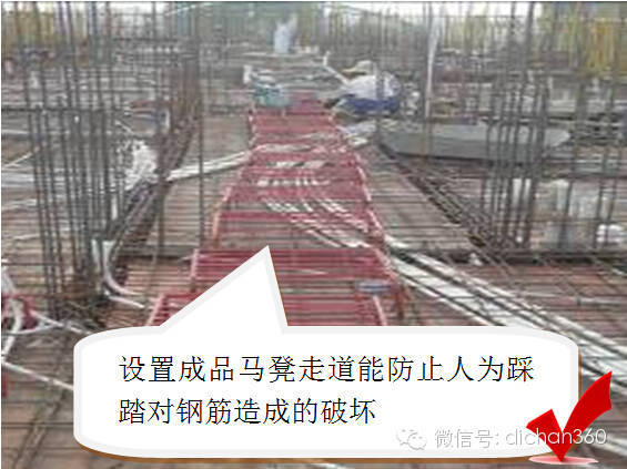 4、顶板砼浇筑时应对钢筋采取保护措施,以防踩踏变形,如用钢管跳板搭设临时通道、在钢筋网上铺设木跳板、设置成品马凳等,浇筑时指派专人监管,及时对变形移位的钢筋进行恢复。
