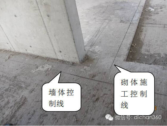 做法(当地有特殊要求的除外),统一改为斜砌(包括连锁砌块),斜砌角度为45~60,砌体工程砌筑完成7天后方可进行斜插砖砌筑。砌体施工前必须弹控制线(如上图),严禁随梁或墙直接砌筑,特别是飘窗及空调板等转角部位,并且在距墙边375px左右位置弹出墙体控制线,作为抹灰时打点套方的控制线。