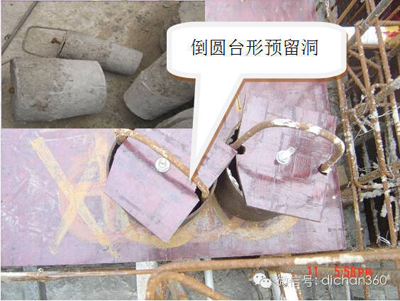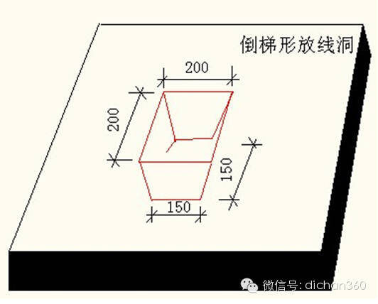 9、厨卫间主排水、排烟(气)道以及泵管、放线孔预留洞均采用倒梯形(或倒圆台)的定型模板留置。如泵管预留洞,上口统一要求为不大于300*300mm,下口为250*250mm;放线孔上口尺寸为不大于200*200mm,下口为150*150mm。
