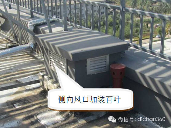 3、厨卫间出屋面排气管和排烟道:外露排气管统一要求使用铸铁管(一般管径100mm,外刷黑漆),排烟道使用实心砌体砌筑,侧向风口须加装铝质百叶或在顶部直接安装无动力风帽,二者高度均不得低于女儿墙或坡屋面最高点,在坡屋面上留置时高度控制600mm左右,烟道整体装饰风格与屋面或女儿墙保持一致。同时屋面消防管道保温外包裹材料规定统一选用热镀锌板,以增强耐久性。