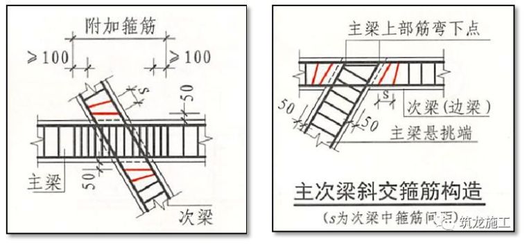 1、主次梁交接处,主梁两侧附加箍筋。主次梁交接处未布置箍筋,只布附加箍筋为错误做法。