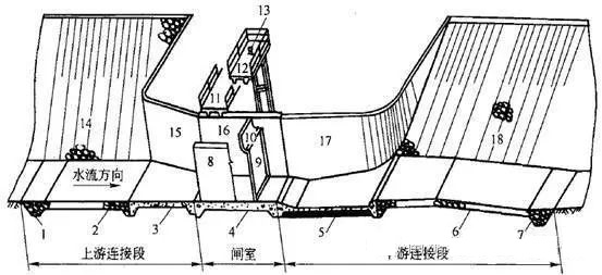 闸室是水闸的主体,设有底板、 闸门、 启闭机、闸墩、胸墙、工作桥、交通桥等。闸门用来挡水和控制过闸流量,闸墩用以分隔闸孔和支承闸门、胸墙、工作桥、交通桥等。底板是闸室的基础,将闸室上部结构的重量及荷载向地基传递,兼有防渗和防冲的作用。闸室分别与上下游连接段和两岸或其他建筑物连接。上游连接段包括:在两岸设置的翼墙和护坡,在河床设置的防冲槽、护底及铺盖,用以引导水流平顺地进入闸室,保护两岸及河床免遭水流冲刷,并与闸室共同组成足够长度的渗径,确保渗透水流沿两岸和闸基的抗渗稳定性。下游连接段,由护坦、 海漫、 防冲槽、两岸翼墙、护坡等组成,用以引导出闸水流向下游均匀扩散,减缓流速,消除过闸水流剩余动能,防止水流对河床及两岸的冲刷。