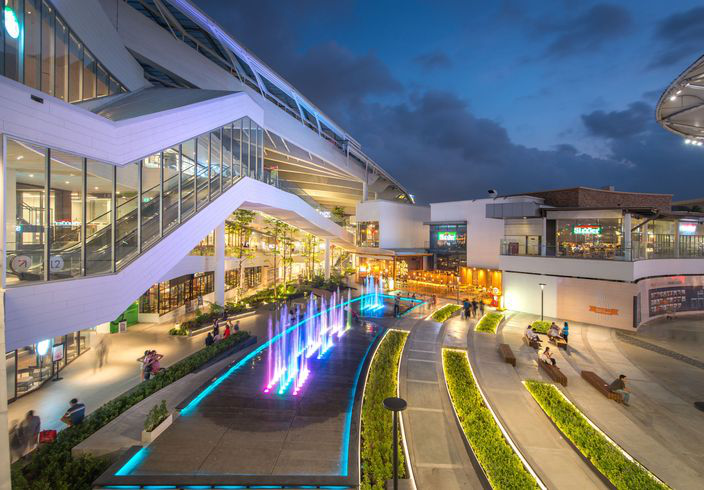 景观灯是购物中心设计中重要组成部分。景观照明指既有照明功能,又兼有艺术装饰和美化环境功能,其以多变的造型、绚烂的光色与不同的亮度打造出宜人的景观氛围。