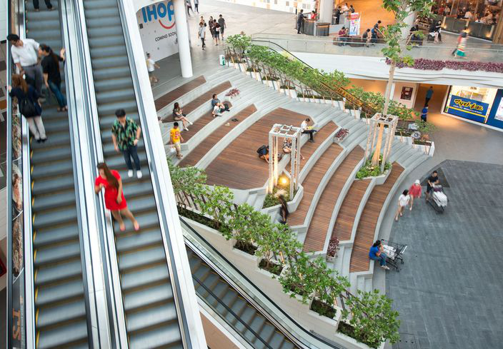 绿化是购物中心中不可或缺的元素之一,除了具有一定的观赏价值之外,还有利于净化空气、降低噪音、调节小气候的作用,给人们带来身体上的舒适和心情上的愉悦。