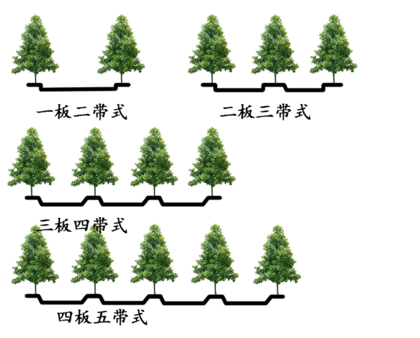 校园主干道这类道路,一般都设有人行道,行道树种植于人行道外侧。校园干道的绿化有一板二带、二板三带等主要形式;另有林荫道、花园路等。
