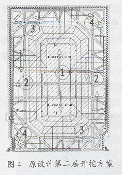 由于栈桥底部及南北坑中部掏土工期约10天(土方量较大约20000 m3),按原设计方案第二道支撑将推迟近10d完成,故采取从角部(西北和东南角)先现行开挖的方式,缩短技术间歇时间。完成①部位挖土后,随之进行②部位的挖土,塔楼四角斜对称相继完成,从而减少了围护体在跨中部位的弯矩。④区土方最后开挖,此期间第二道支撑已全部完成并进入养护期为下层土方开挖提前进行奠定了基础(如图5 )。
