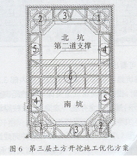 原设计方案基坑中①区土方先行开挖,待南北坑盆中土开挖完成后进行东西两侧②区开挖,完成东西横向支撑施工,角撑部位最后完成。但经分析,因塔楼基坑东侧距离临房基础较近,最近处约15m且临房基础埋深较浅(约7m ) ,如采用设计方案实施开挖时,中部东西向横撑在基坑大面积开挖后第15d 方完成,维护体因承受临房基础挤土效应而产生较大变形量。临房观测数据表明,在第三层土方开挖时,其基础沉降和倾斜数值相对明显(沉降量为14mm倾斜量为15 mm,接近设计报警值),为开挖阶段形变量之最大时期,如不采取相应措施,将导致临房原有裂缝加剧,引发诸多不利影响。
