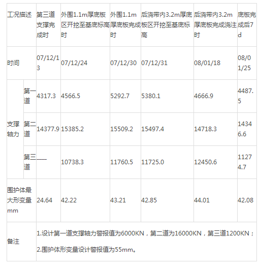 (2)提高了开挖作业期间基坑的安全性能。本方案实施后,在最短时间内完成换撑,使大底板浇注时间提早,监测数据表明围护体受力变化均衡,证明此优化方案的切实可行。