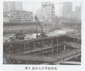 从第四层土方开挖(2007年12月16日)至大底板浇注完成(2008 年1月18日),总计施工天数为30余天,比该阶段原计划提前了15d,将快挖快撑的挖土特点发挥得淋漓尽致。