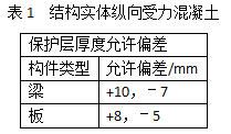 结构实体受力钢筋的混凝土保护层厚度的检验,考虑到工程施工扰动等不利因素的影响,在混凝土保护层厚度检验时,允许有一定的偏差。偏差值应在结构施工图中给出,并可在相关规范规定的混凝土保护层厚度数值的基础上作适当调整,其纵向受力钢筋的混凝土保护层厚度允许偏差值应符合表1的规定。