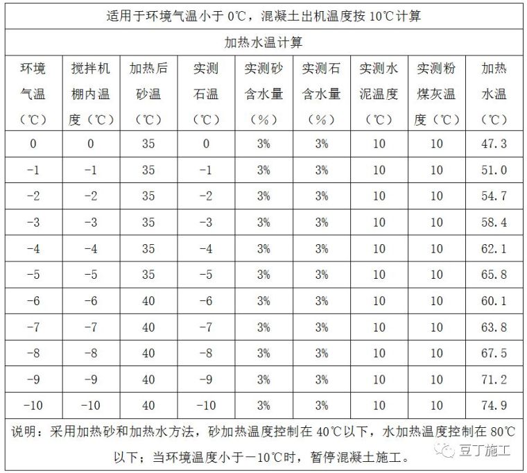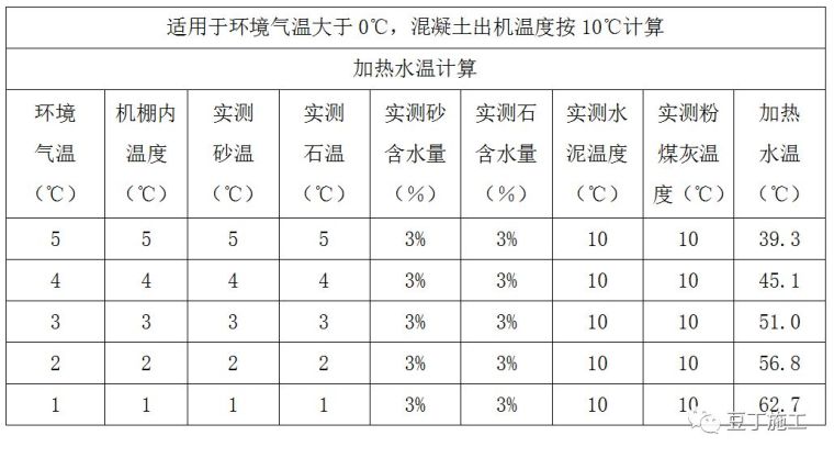 2、当环境温度在0℃以上时,仅需将水加热到表中温度;当气温小于0℃时,需采用将水、细骨料至加热至表中的温度。