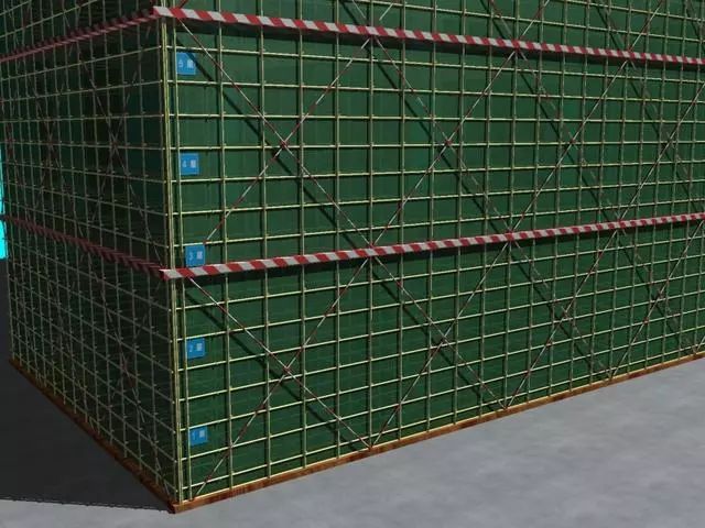 (2)脚手架钢管表面涂刷黄色油漆,剪刀撑和警示带表面涂刷红白警示漆,脚手架内侧满挂绿色密目安全网,安全网封闭严密,张紧、无破损,颜色新亮;