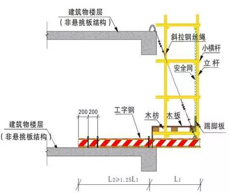 (1)悬挑主梁应使用整根槽钢(或工字钢),型号不得小于[20,两侧应分别设置前后两道斜拉钢丝绳,钢丝绳直径不小于21.5,锚固端预埋20U型环;