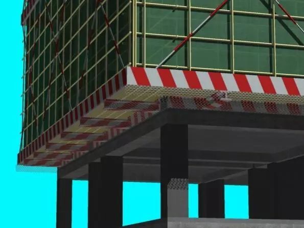 (3)脚手架架体及悬挑梁固定符合规范要求,架体底层应采用硬质防护进行封闭,硬质防护底面涂刷黄色油漆,每隔3层或10m设置一道200mm警示带,固定于立杆外侧,当防护高度超过100m时,每隔10m设置黄色密目安全网警示带,横杆露出架体外立面长度为100-150mm。