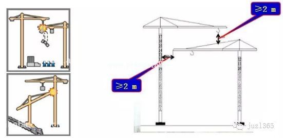 多塔多台塔机之间的最小架设距离应保证处于低位塔机的起重臂端部与另一台塔机的塔身之间至少有2m的距离;处于高位塔机的最低位置的部件(吊钩升至最高点或平衡重的最低部位)与低位塔机中处于最高位置部件之间的垂直距离不应小于2m。