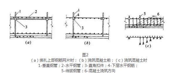 图2(a)指出绑扎上部钢筋网片用的钢管支撑。在上部钢筋网片绑扎完毕后,需置换出水平钢管;为此另取一些垂直钢管通过直角扣件与上部钢筋网片的下层钢筋连接起来(该处需另用短钢筋段加强),替换了原支撑体系,见图2(b)。在混凝土浇筑过程中,逐步抽出垂直钢管,见图2(c)。此时,上部荷载可由附近的钢管及上、下端均与钢筋网焊接的多个拉结筋来承受。由于混凝土不断浇筑与凝固,拉结筋长细比减少,提高了承载力。