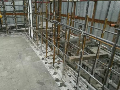 墙根凿毛均匀美观,垃圾清理到位,剪力墙竖向、水平筋搭接三点绑扎。